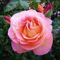 Лепестки розовые, с кремовой оборотной стороной, но весь цветок вначале имеет желтый оттенок, так что кажется оранжевым до тех пор, пока желтый не начнет выгорать, начиная с внешних лепестков, и розовый не начнет доминировать. Цветки крупные, с сильным ароматом, густомахровые, в старинном стиле. Появляются по одному, изредка по 2-3 на длинных сильных побегах, так что хорошо подходят для срезки. Листва темная, блестящая, устойчивая к заболеваниям. Превосходная роза.
